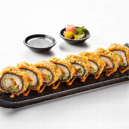 Crispy tempura, kani, cucumber, and cream cheese wrapped in sushi rice and nori, topped with golden kunafa and finished with Sumo signature sauce and spicy mayo.
