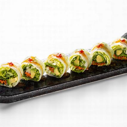 Avocado, carrots, asparagus, iceberg, and hiyashi wakame wrapped in a thin layer of cucumber and served with a side of Japanese dressing (5 pieces)
