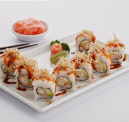Prawn tempura, crabstick, avocado, and cream cheese. Topped with ebi sushi, and drizzled with spicy mayo and teriyaki sauce